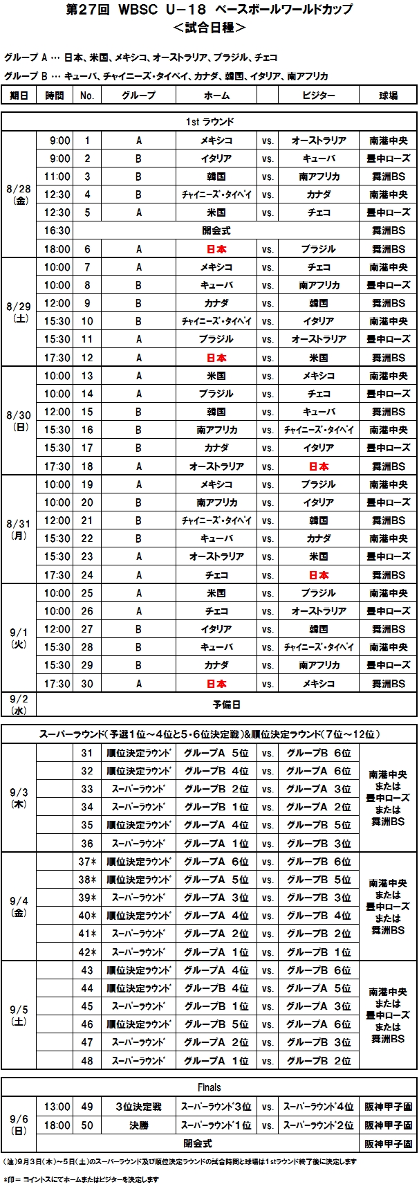 第27回WBSC U-18ベースボールワールドカップ 試合日程発表野球日本代表 侍ジャパンU-18代表
