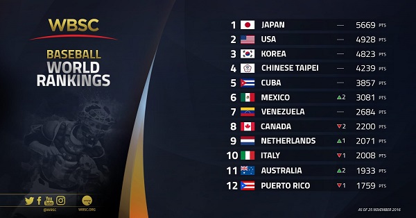 ・WBSCが最新の野球世界ランキングを発表。日本は1位を維持!(2016-08-29)