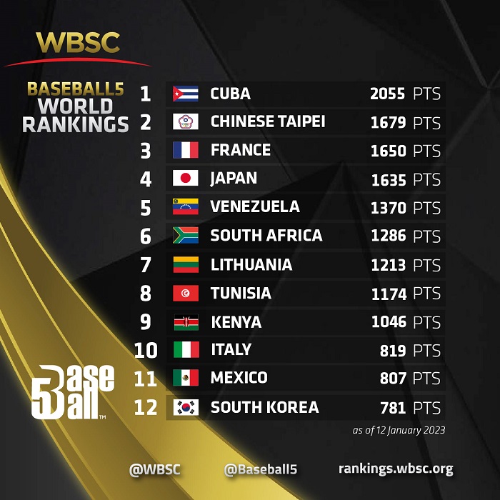 世界野球ソフトボール連盟(WBSC)は、初のBaseball5世界ランキングを発表しました。