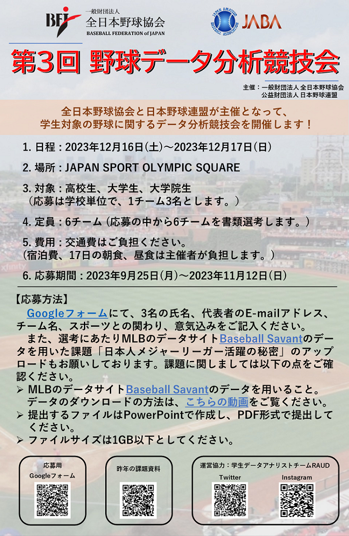 全日本野球協会(BFJ)と日本野球連盟(JABA)は、本年もこれからの野球界を支えるデータと指導現場を繋ぐアナリストやデータサイエンティスト、コーディネーター人材の育成を目的として、「第3回 野球データ分析競技会」を開催いたします。