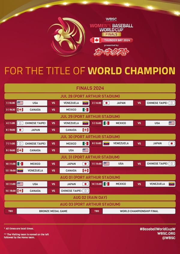 世界野球ソフトボール連盟(WBSC)より、7月28日から8月3日にかけてカナダのサンダーベイにて開催される第9回 WBSC 女子野球ワールドカップ ファイナルpresented by カーネクストの試合日程が発表されました。