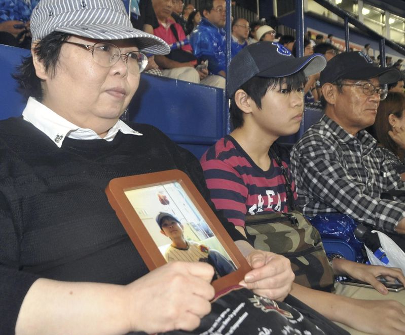 Yamato’s mother Miwa, 49, was on hand to witness Miura’s gallant effort from seats behind home plate with a photo of her son resting on her lap.