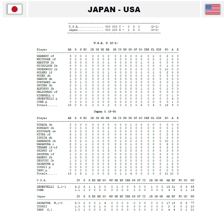 Japan’s pitching staff (ERA 0.00) has been very stingy on all accounts, refusing to distribute free passes (walks), and selectively handing out only seven walks in five games -- that’s compared to 22 strikeouts.