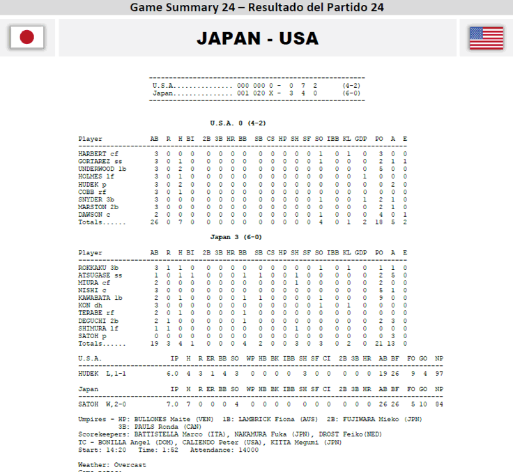 Japan’s Ayami Sato (Overall: 2-0, 0.00 ERA, 10 K, 0 BB) tossed a 7-inning, complete-game shutout to earn the win and honour of being named the 2014 World Cup “Most Valuable Player”.